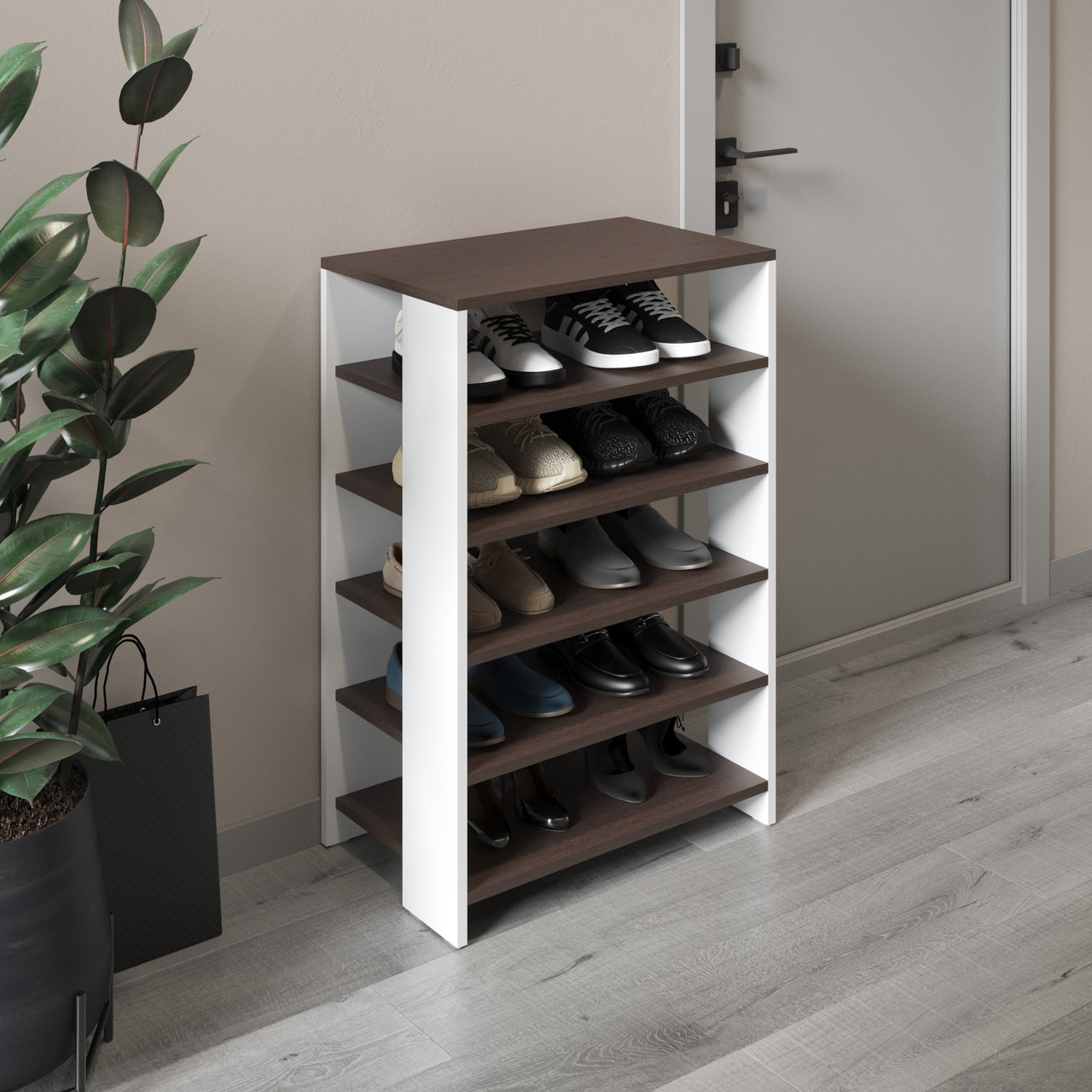 Полиця для взуття в передпокій h90*60*34 см у кольорі білий з полицями венге темний