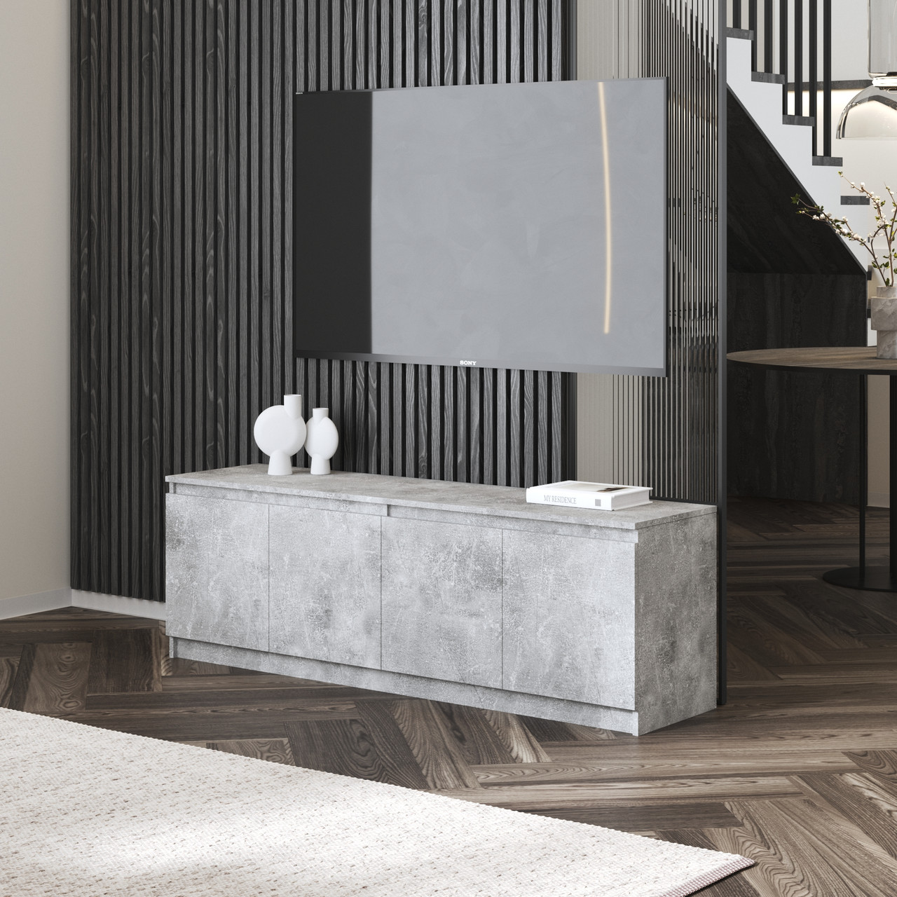 Тумба під телевізор без ручок колір бетон з полицями 160*53*40 см