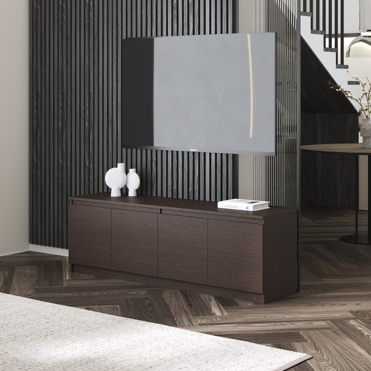 Тумба під телевізор з 4 полицями та 4 дверима у кольорі Венге темний - це чудовий варіант для Вашої вітальні або спальні де буде телевізор. Проста і максимально функціональна тумба під TV прикрасить Вашу кімнату і чудово впишеться в будь-який сучасний інтер'єр!